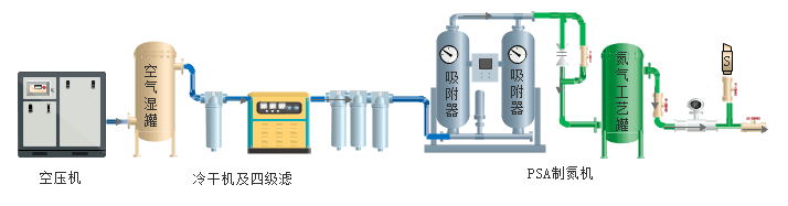空壓機(jī)→空氣緩沖罐(濕罐)→C級(jí)過(guò)濾器→冷凍式干燥機(jī)→T級(jí)過(guò)濾器→A級(jí)過(guò)濾器→H級(jí)過(guò)濾器→制氮機(jī)主機(jī)→氮?dú)饬髁浚兌?,壓力檢測(cè)→氮?dú)鈨?chǔ)氣罐→使用點(diǎn)